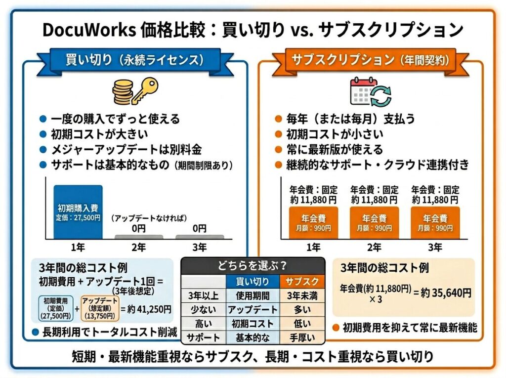 DocuWorksの主な購入形態には、一度の支払いで永続的に利用できる「買い切り(パッケージ版)」と、月額または年額で料金を支払う「サブスクリプション」の2種類が存在します。
